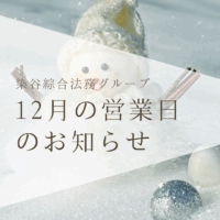 12月の営業日カレンダー 朝晩の冷え込みが一段と増し、冬の訪れを感じる季節となりました。 皆さまいかがお過ごしでしょうか。 年末に向けて、相続や登記などのご相談が増える時期でもあります。 ご来所の際は、混雑を避けるため事 …