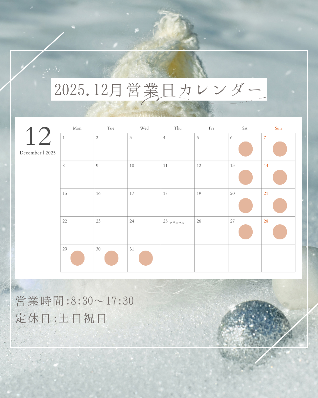 また、年末年始は12月27日(土)から1月4日(日)までお休みをいただく予定でございます。