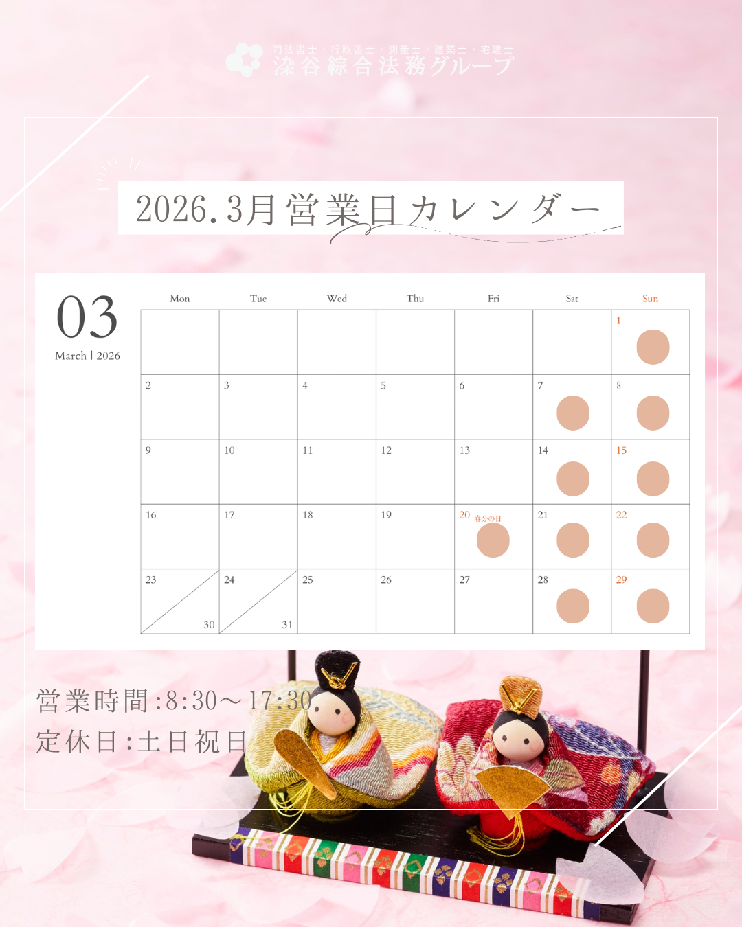 3月は年度末を迎え、ご相談が特に増える時期です。 お待ち時間を少なくスムーズにご案内できるよう、ご来所の際は事前のご予約にご協力いただけますと幸いです。 新年度に向けて安心してスタートを切っていただけるよう、スタッフ一同しっかりとサポートしてまいります。